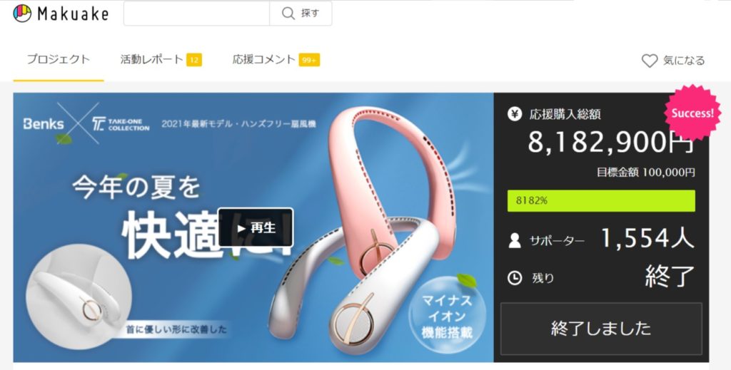 某クラウドファンディングで8,182,900円、8182%のサポートがあった、あの扇風機です。