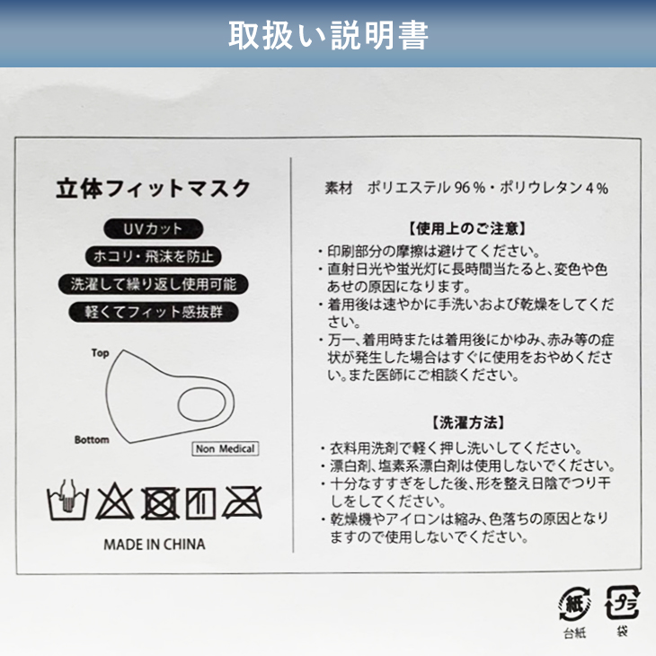 環境にも配慮し、無駄なパッケージを省き、取扱い説明書とマスクを1枚づつOPP袋に入れた簡易な包装。 洗って繰り返しご使用いただけるエコなマスクです。