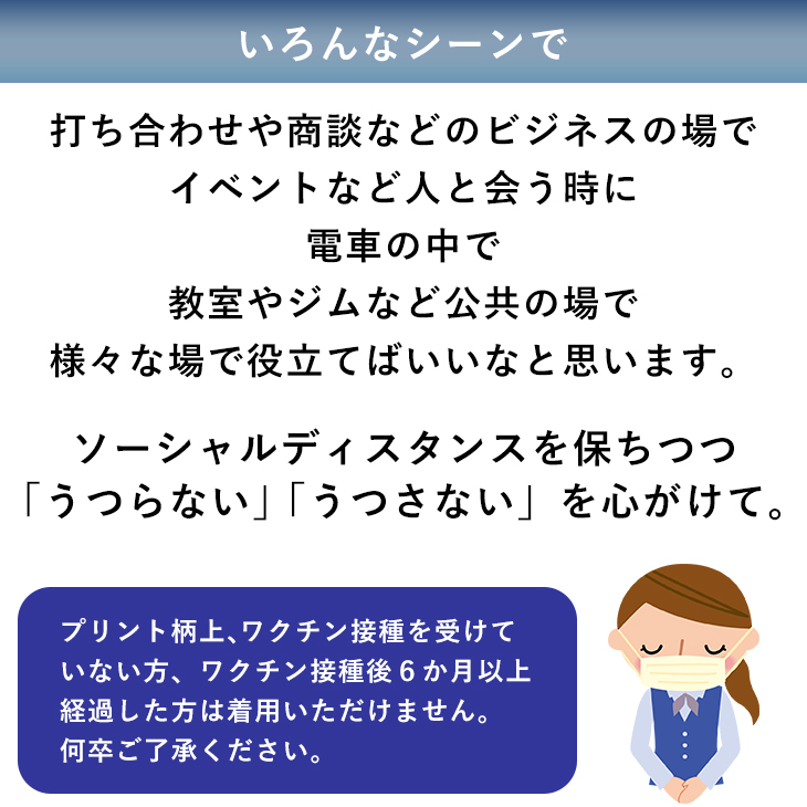 友達や仲間と会う時、離れた家族に会う時、電車の中、打ち合わせやミーティングで人と会うビジネスマン、登校している学生さん、何かしらのイベント時など、周りへの気配りとして様々なシーンでお役立ていただければと思います。