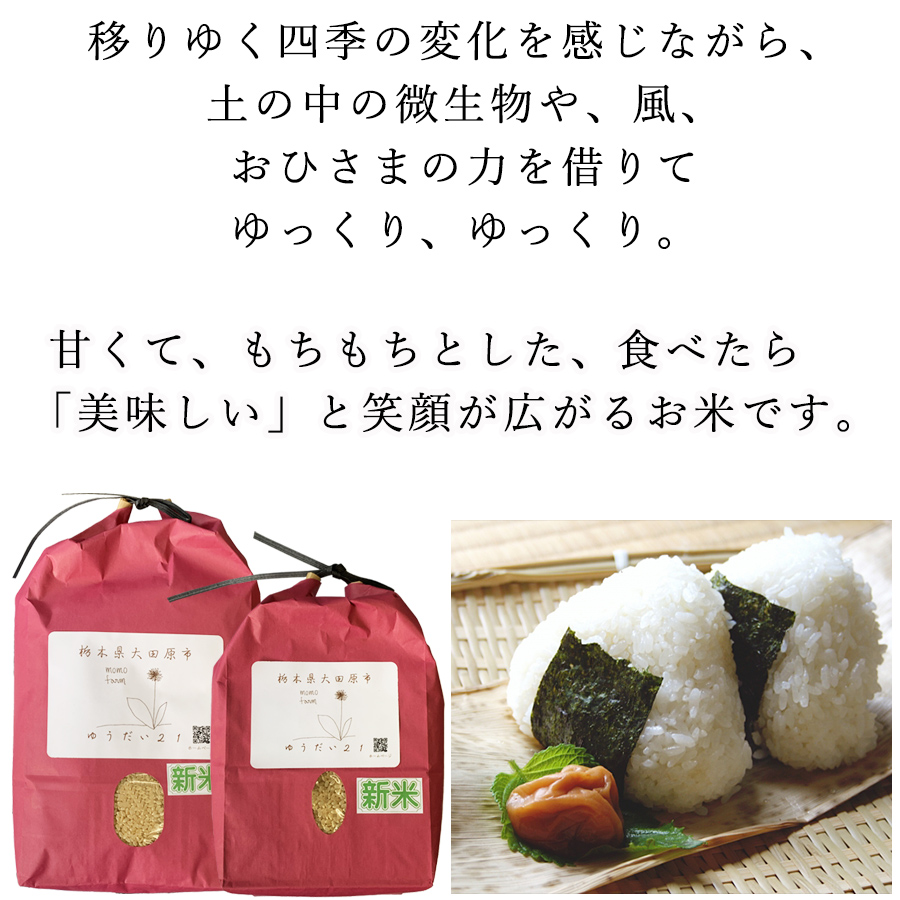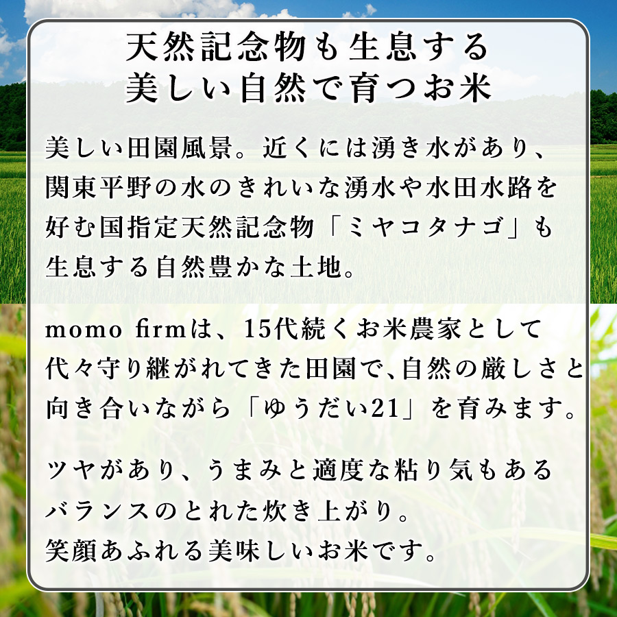 環境に優しく、自然の恵みをいっぱい受けて育った「ゆうだい21」、新米をご賞味ください。